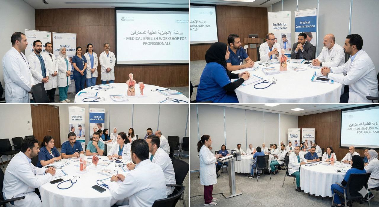 الوصف: ورشة للطلاب والمتخصصين في المجال الصحي لتطوير مهارات التواصل باللغة الإنجليزية في السياقات الطبية والأكاديمية.